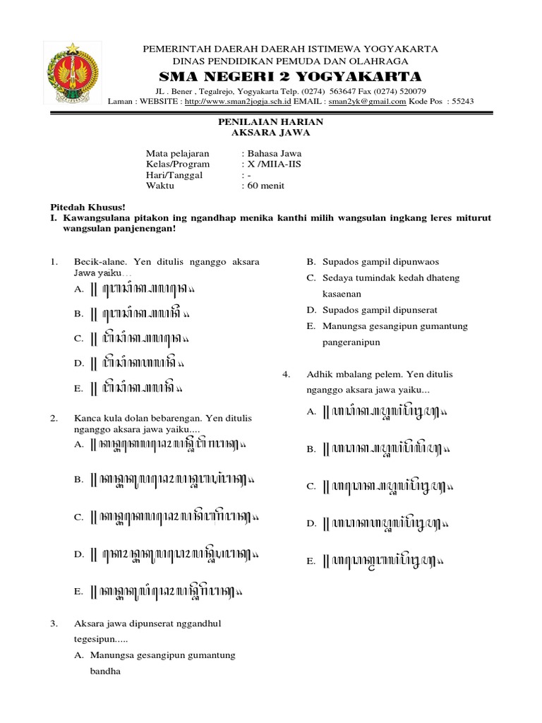 Hampir ratusan bahkan ribuan tapi bukan hanya suku dan bahasa saja tetapi ternyata indonesia juga memiliki banyak macam aksara atau sistem. Entuk kenalan karo awakmu ora? Soal aksara jawa pilihan ganda dan jawabannya yang bisa bapak ibu guru unduh secara gratis dengan menekan tombol download. Contoh soal aksara jawa pilihan ganda dan jawabannya yang ada di artikel the beats blog kali ini saya bagikan khusus untuk semua guru mata. Aksara jawa ini sudah lama sekali dipakai di berbagai wilayah nusantara seperti pulau jawa sendiri, makassar, melayu, sunda, bali, sasak dan digunakan untuk penulisan karya sastra yang berbahasa jawa.